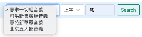 1.選擇佛典、2.選擇上字或下字、3.輸入欲查詢的字、4.Search 取得結果